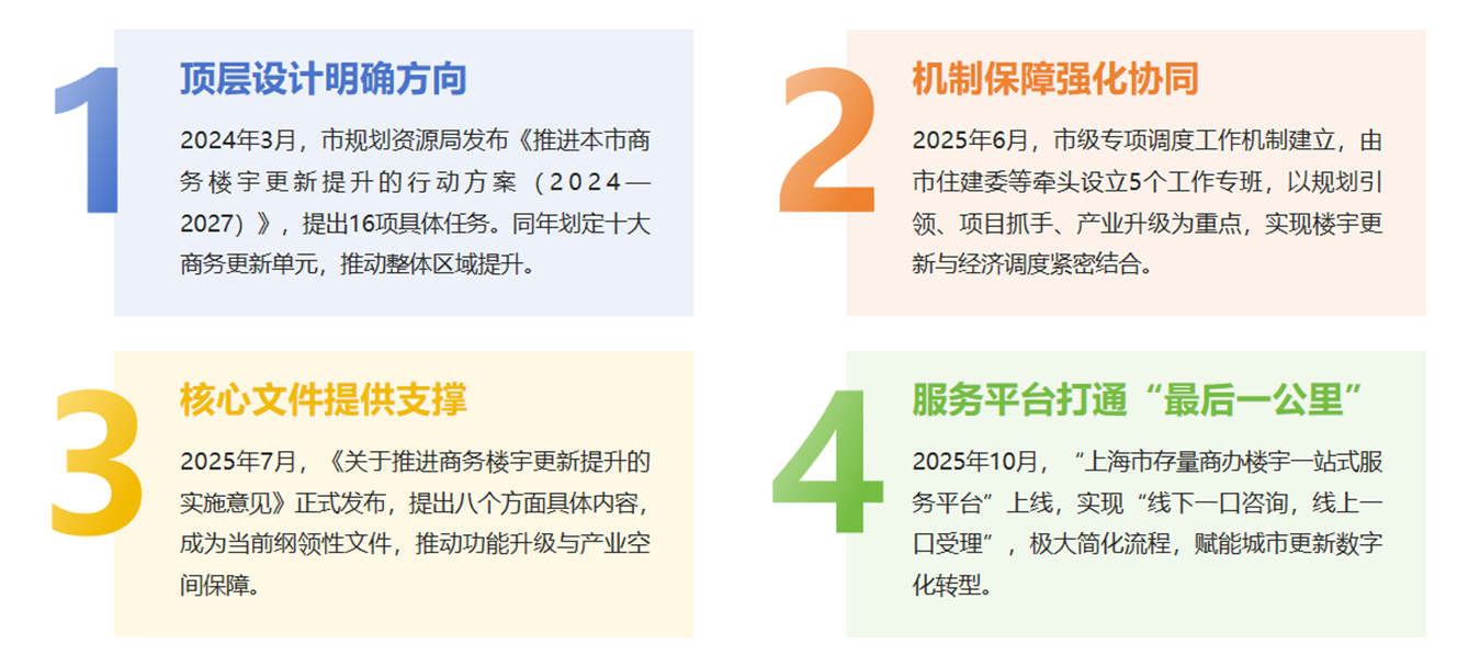 2025年7月,《关于推进商务楼宇更新提升的实施意见》(沪府办发〔2025〕13号)正式发布,提出了八个方面的具体内容,是当前指导工作的纲领性文件。其核心精神在于推动功能升级、提升运营能力、保障产业空间、促进功能复合、优化区域环境、创新推进机制。