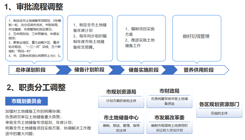 新的土地储备工作包括总体谋划、储备计划、储备实施及管养供用四阶段,其中储备实施阶段包括实施方案编制工作,由市土地储备中心为责任主体,市规划资源局为审批主体,市财政局、市发展改革委参与审批。