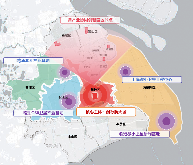 从产业链布局角度来看,闵行区以闵行航天城为集聚载体,以航天八院为龙头引领,重点布局火箭、导航、通信等产业链环节;青浦区北斗西虹桥基地以华测导航为代表,专注北斗导航位置服务应用;浦东张江、临港的代表企业中国星网、上海微小卫星工程中心,主要聚焦卫星制造与卫星系统运营管理,是卫星制造的集聚区;松江区依托G60卫星互联网产业基地,以垣信卫星、上海格思航天等企业为引领,重点发展卫星通信网络运营、卫星批量制造及相关应用服务;虹口则侧重航天技术融合应用,积极培育与航天相关的软件研发、数据服务、科创服务等高端服务环节。
