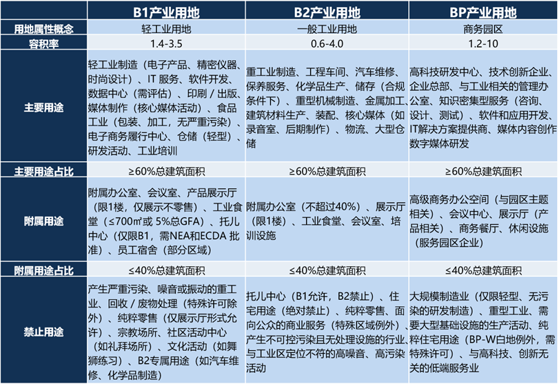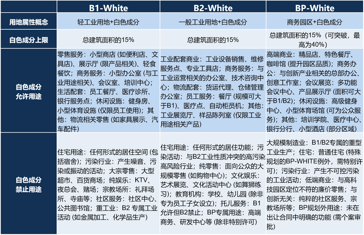 除去普通的B1、B2、BP产业用地外,还有些产业用地被标记上了W(White)的符号,即 B1-W、B2-W、BP-W三类,表明该地块具有白色成分。相较于普通产业用地,具有白色成分的产业用地设置了不高于总建筑面积15%的白色用途(BP-W白色成分比例可突破),且具有明确的允许用途与禁止用途(详见表2)。开发商可在合同范围内灵活调整白色区域功能,无需额外缴纳土地溢价。