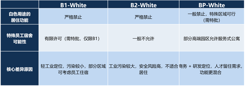 其中,需要格外注意的是,由于考虑B1和B2本质是工业生产区域,所以B1-W和B2-W中都明确禁止了居住功能,但有专门的员工宿舍政策,需单独申请。特定区域的BP-W在特别许可下可包含少量的居住功能(详见表3)。