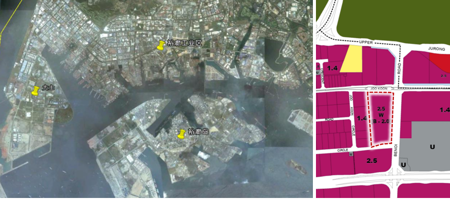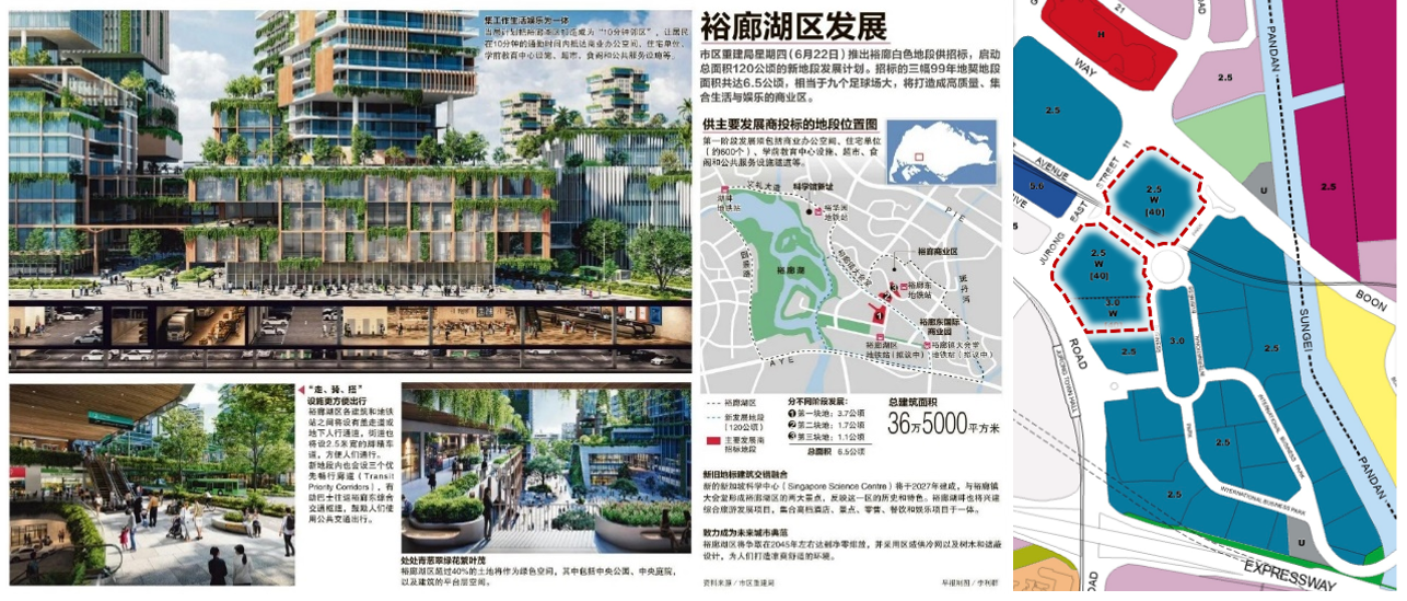 2023年上半年推出的裕廊湖片区6.5公顷白地,成为新加坡西部开发的核心引擎。这块连接两条地铁线路的黄金地块,规划总建筑面积约36.5万平方米,包含18万平方米产业空间、1760套私人住宅,以及7.5万平方米零售、酒店或社区配套业态。政策设计上采用分期开发、弹性调整的模式,要求第一阶段必须完成7万平方米产业空间和600套住宅建设,剩余部分可在5-10年内根据市场需求优化调整,若区域科创企业集聚加速,可增加科研中试空间,若居住需求旺盛,可优化住宅与商业配比。这种规划模式让土地价值实现质的飞跃,预计将带动裕廊湖片区成为集产业、居住、消费于一体的新加坡西部新中心,实现一地开发、全域受益的辐射效应。图4(右)位于裕廊湖片区的东侧,是典型的BP产业用地,图中[40]表明该地块的白色成分的比例最高可达到该地块建筑面积的40%。