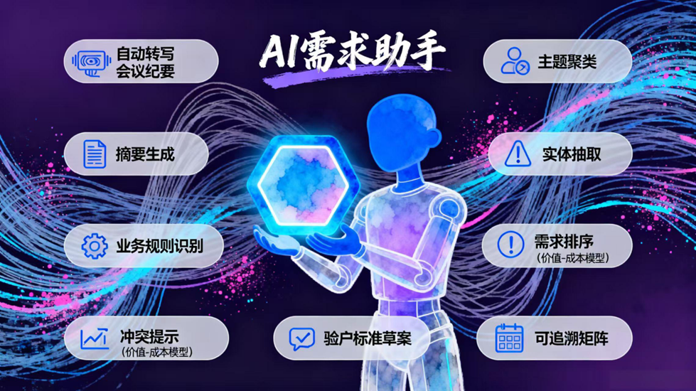 团队不再仅依赖“语音转文字”这一单点工具,而是将一套“AI需求助手”贯穿于需求获取、澄清、优先级评估与全流程追踪:它可自动转写并摘要会议纪要,进行主题聚类与实体抽取,识别业务规则与约束,提示潜在冲突或歧义;同时基于价值—成本模型为需求排序,生成用户故事与验收标准草案,并初步形成需求—设计—测试的可追溯矩阵。