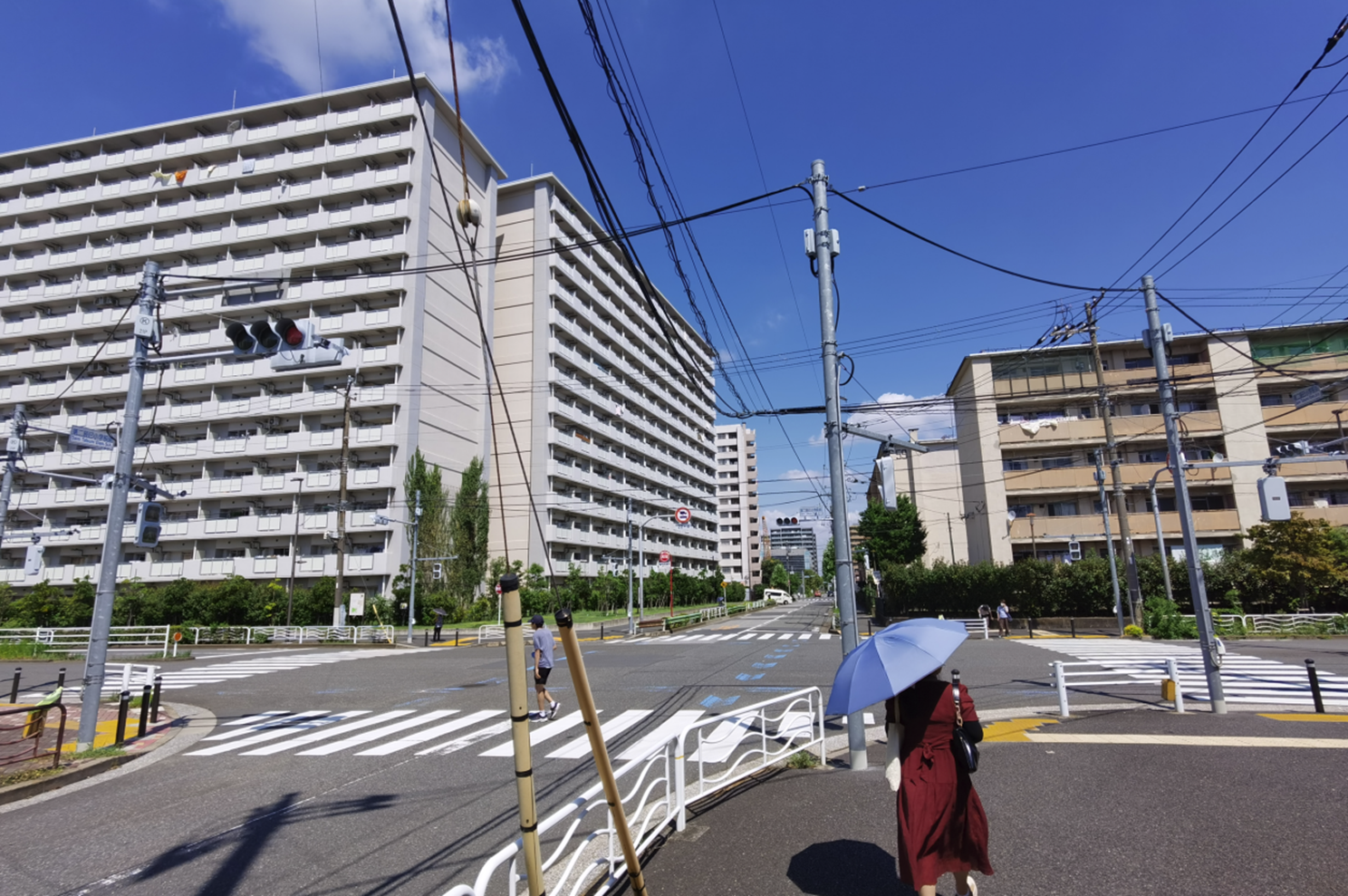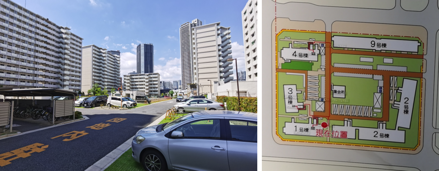 从有乐町线辰巳站出站不到300米,就来到了辰巳团地。可以看到,在道路东侧,还是团地的老房子,一股熟悉的上世纪风扑面而来,五层楼的房屋、房屋上鲜明的楼栋号、多户共用的走廊、菜园绿地混杂的公共区域,让人不敢相信自己就在东京湾,而是像回到了我国上世纪80年代普遍建设的工人新村之中(见图1)。