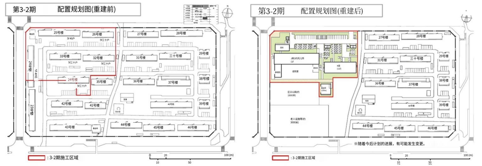 图2:辰巳团地分期改造示意图(南北向道路的西侧主要为已完成团地,